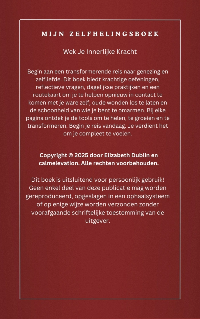 Maar genezing gaat niet alleen over lezen—het gaat om actie. Daarom bevat dit dagboek Elizabeth Dublin’s transformerende zelfhelinggids, waarmee je de wijsheid en hulpmiddelen krijgt om je weg naar innerlijke rust te vinden.